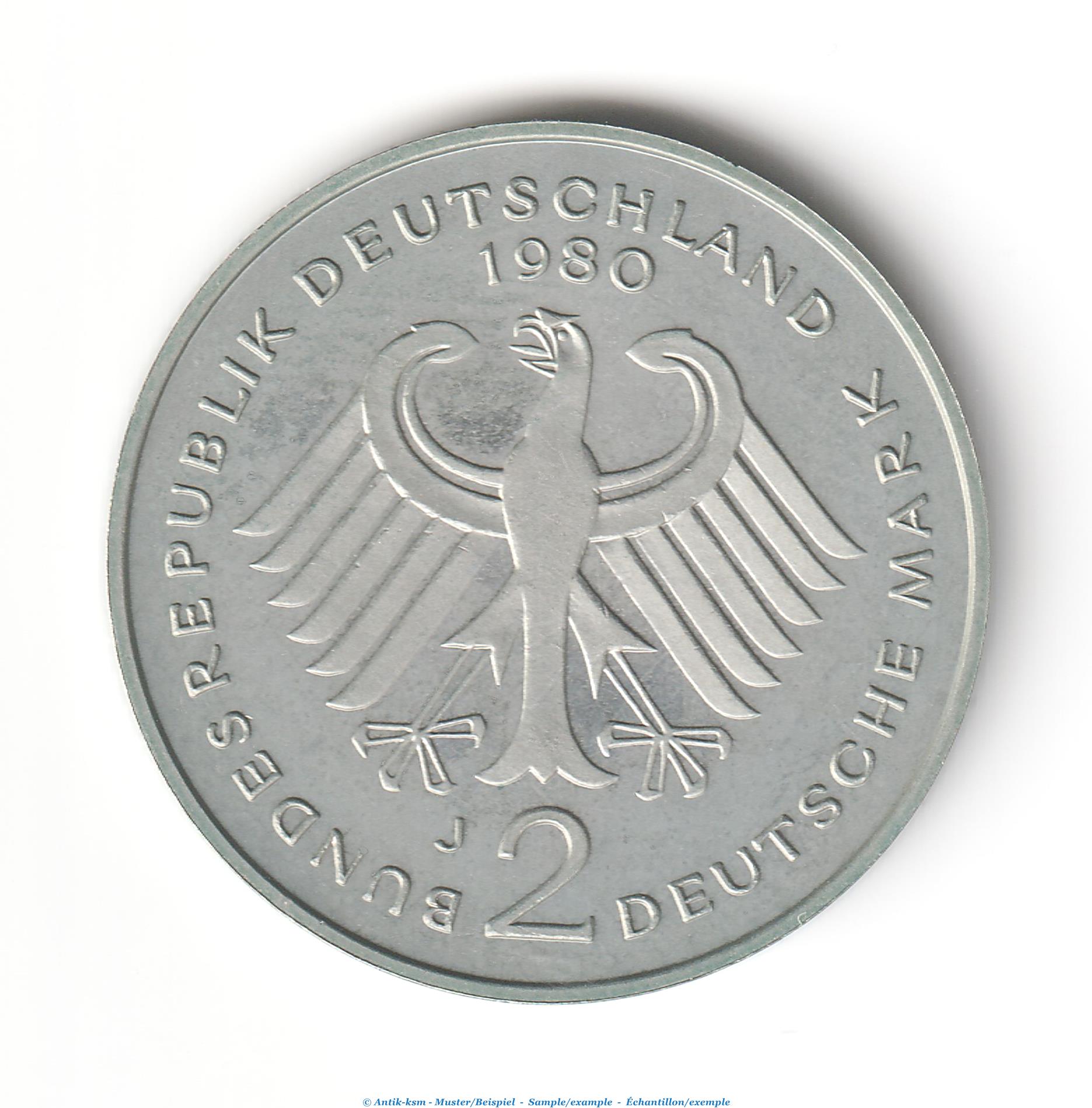 Kursmünze Deutschland , 2 Mark Münze -Theodor Heuss- 1980 J , stgl , J.407 Bundesrepublik
