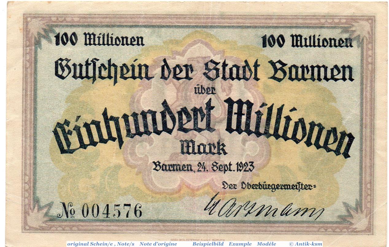 Notgeld über Hundert Millionen Mark , Stadt Barmen , Großnotgeld & Inflation