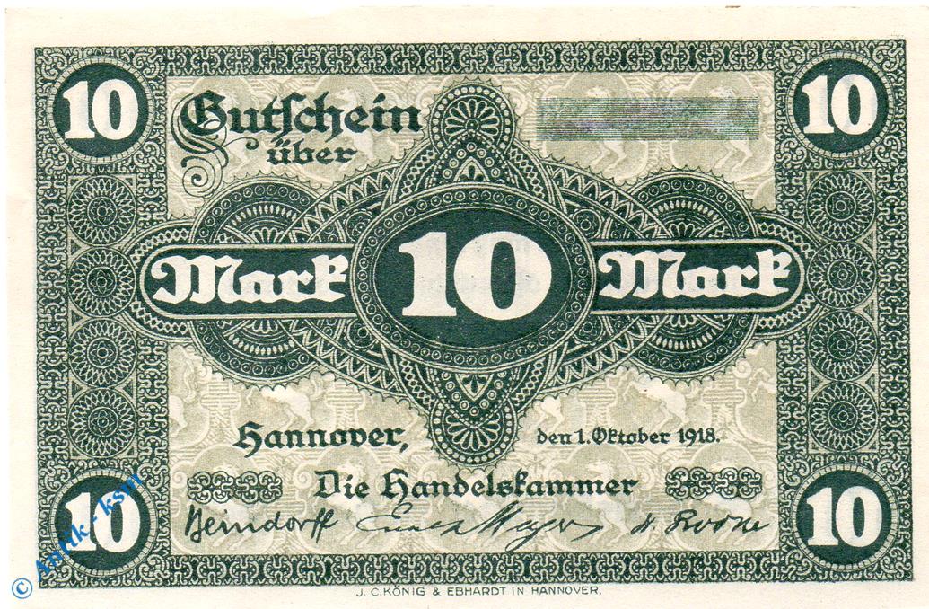 Notgeld Schein über Zehn Mark , Handelskammer Hannover , Großnotgeld , Musterschein