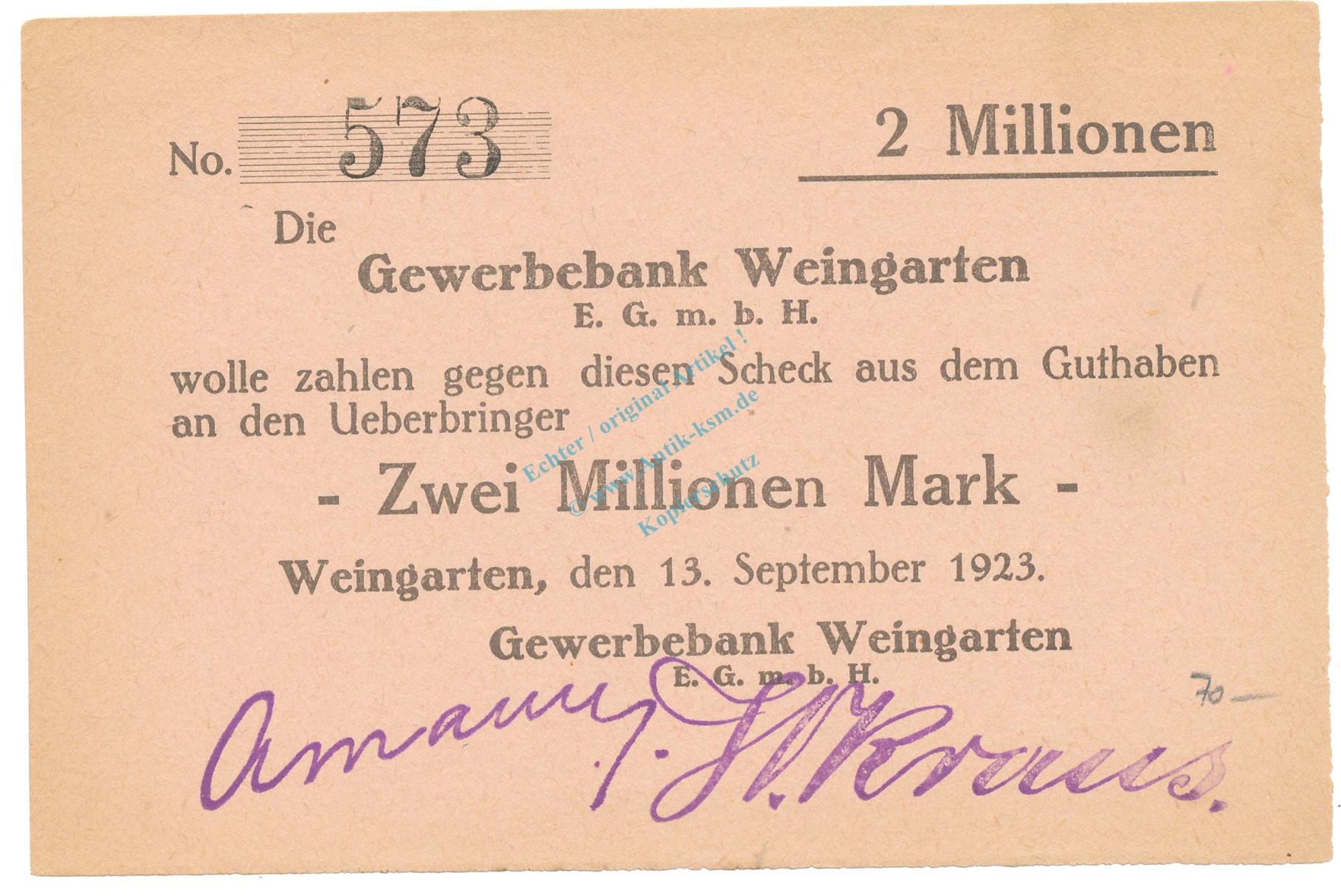 Weingarten , Banknote 2 Millionen Mark Scheck unc-kfr. Ke.5512.C , WÜR 1923 Inflation -3674-