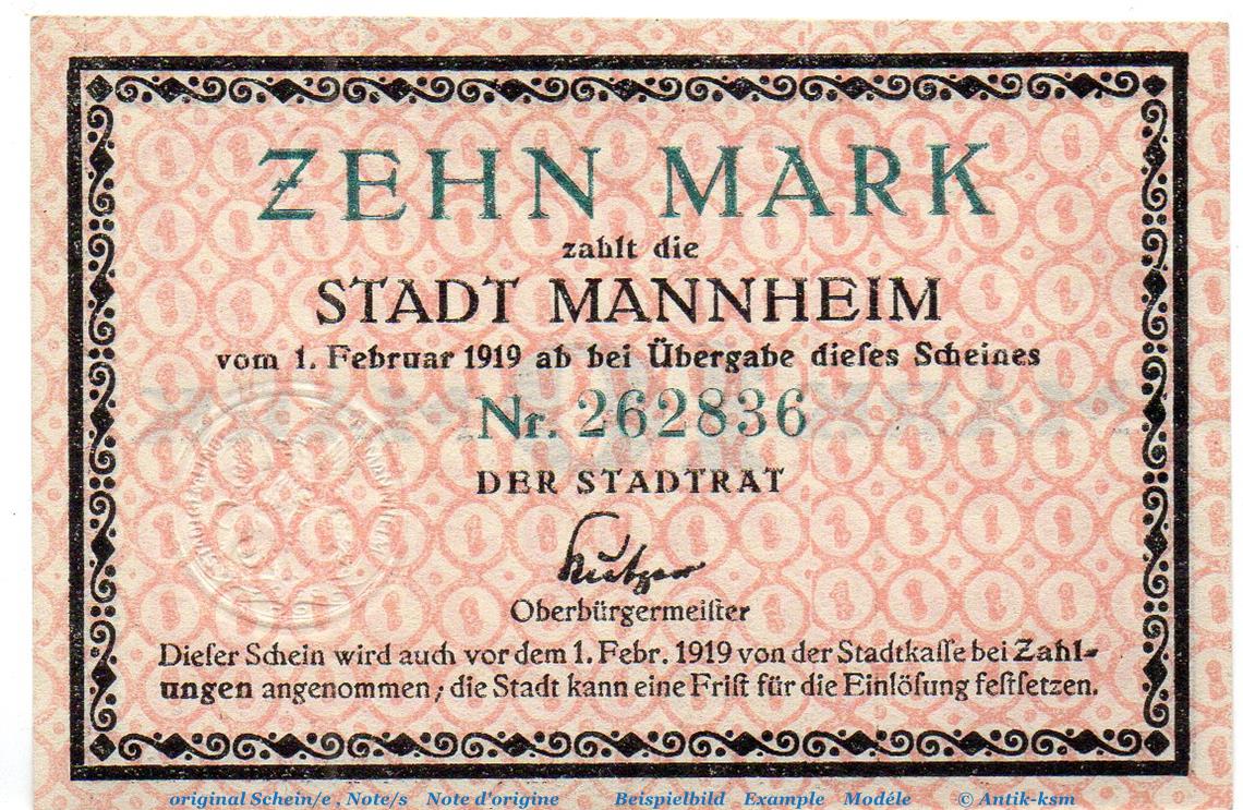 Banknote Stadt Mannheim , 10 Mark nicht entwertet in kfr. Geiger 343.02.a , o.D. Baden Großnotgeld