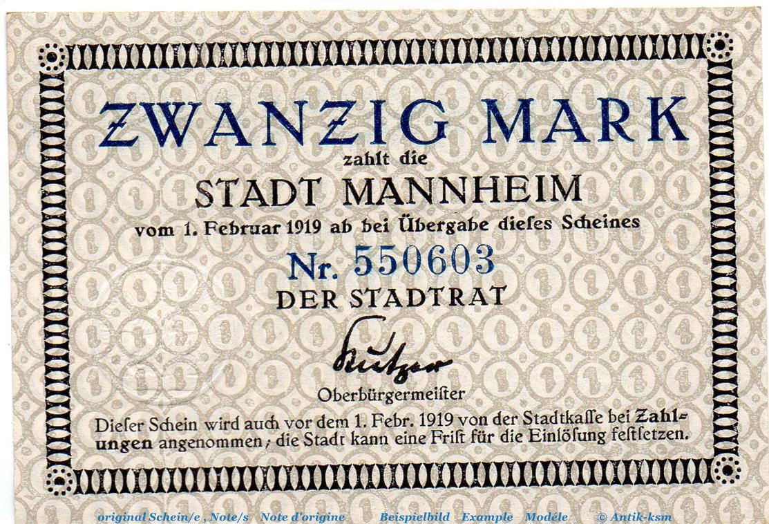 Banknote Stadt Mannheim , 20 Mark nicht entwertet in kfr. Geiger 343.03.a , o.D. Baden Großnotgeld