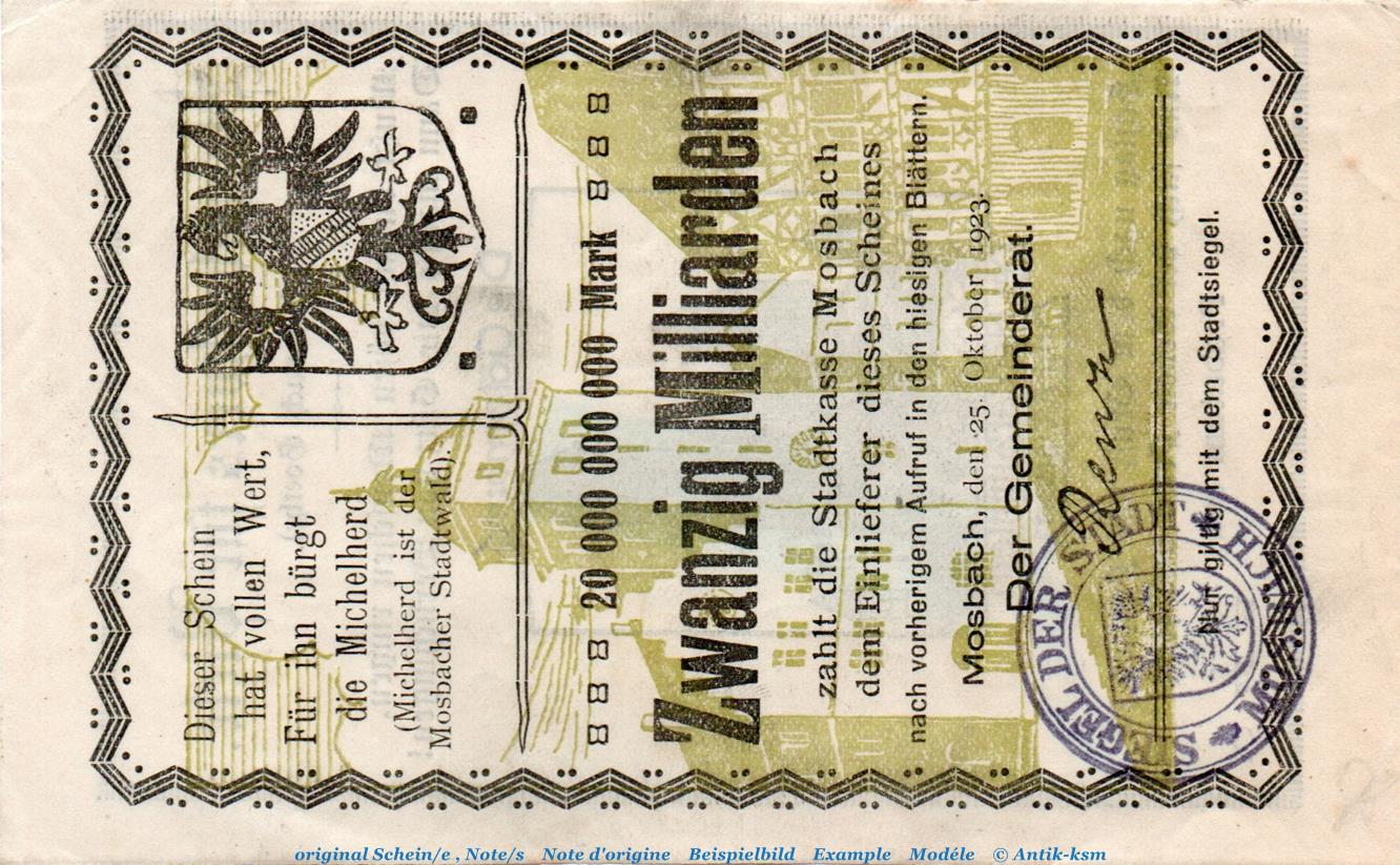 Banknote Stadt Mosbach , 20 Milliarden Mark Schein in kfr. Keller 3606.d von 1923 , Baden Inflation