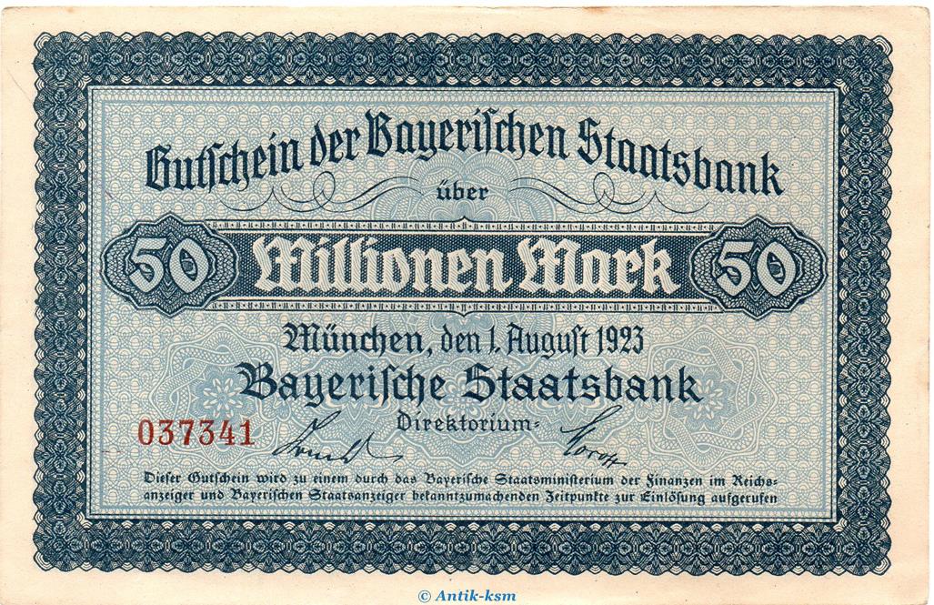 Banknote Bay. Staatsbank München , 50 Millionen Mark Schein in kfr. Keller 3657.c von 1923 , Bayern Großnotgeld - Inflation