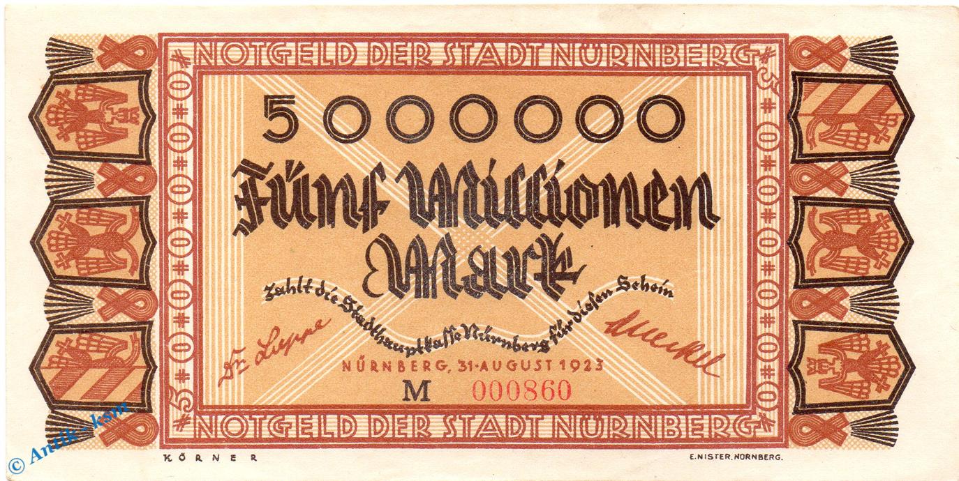 Banknote Nürnberg , 5 Millionen Mark Schein in kfr. Keller 3970.d , 31.08.1923 , Bayern Großnotgeld Inflation