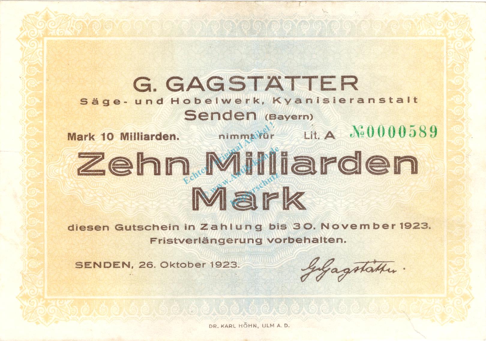 Senden , Banknote 10 Milliarden Mark Schein gbr. Keller 4770 , Bayern 1923 Inflation