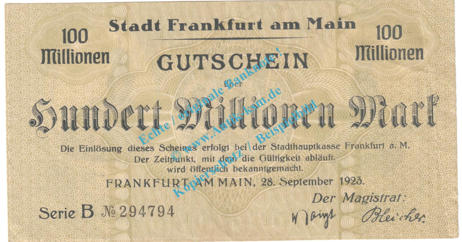 Frankfurt M. Notgeld 100 Millionen Mark Schein in gbr. Keller 1522.k-r , Hessen 1923 Grossnotgeld Inflation