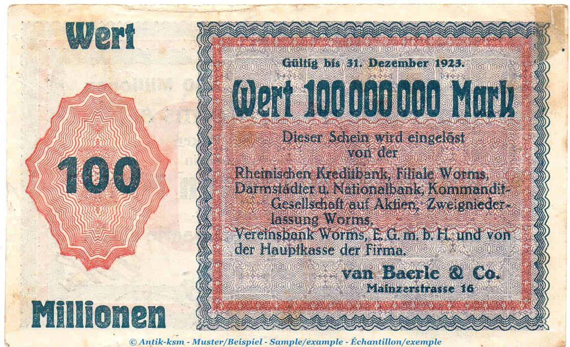 Notgeld van Baerle Worms , 100 Millionen Mark in gbr. Keller 5712 von 1923 , Hessen Inflation