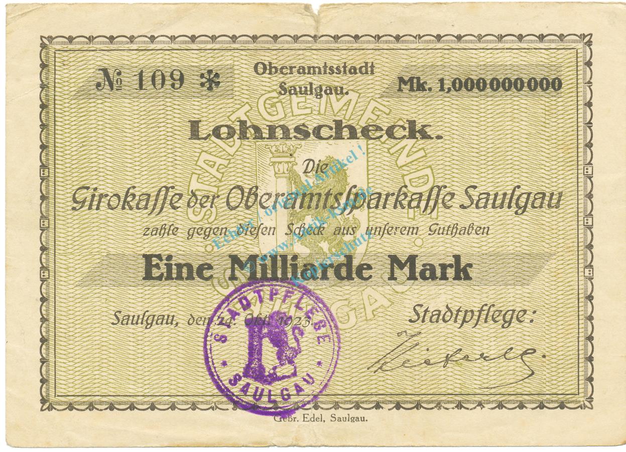 Saulgau , Banknote 1 Milliarde Mark Scheck gbr.- Keller 4721.L , Württemberg 1923 Inflation