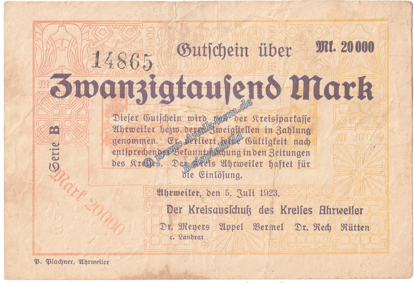 Ahrweiler , Banknote 20.000 Mark Schein in gbr. Keller 20.a , Rheinland 1923 Grossnotgeld - Inflation