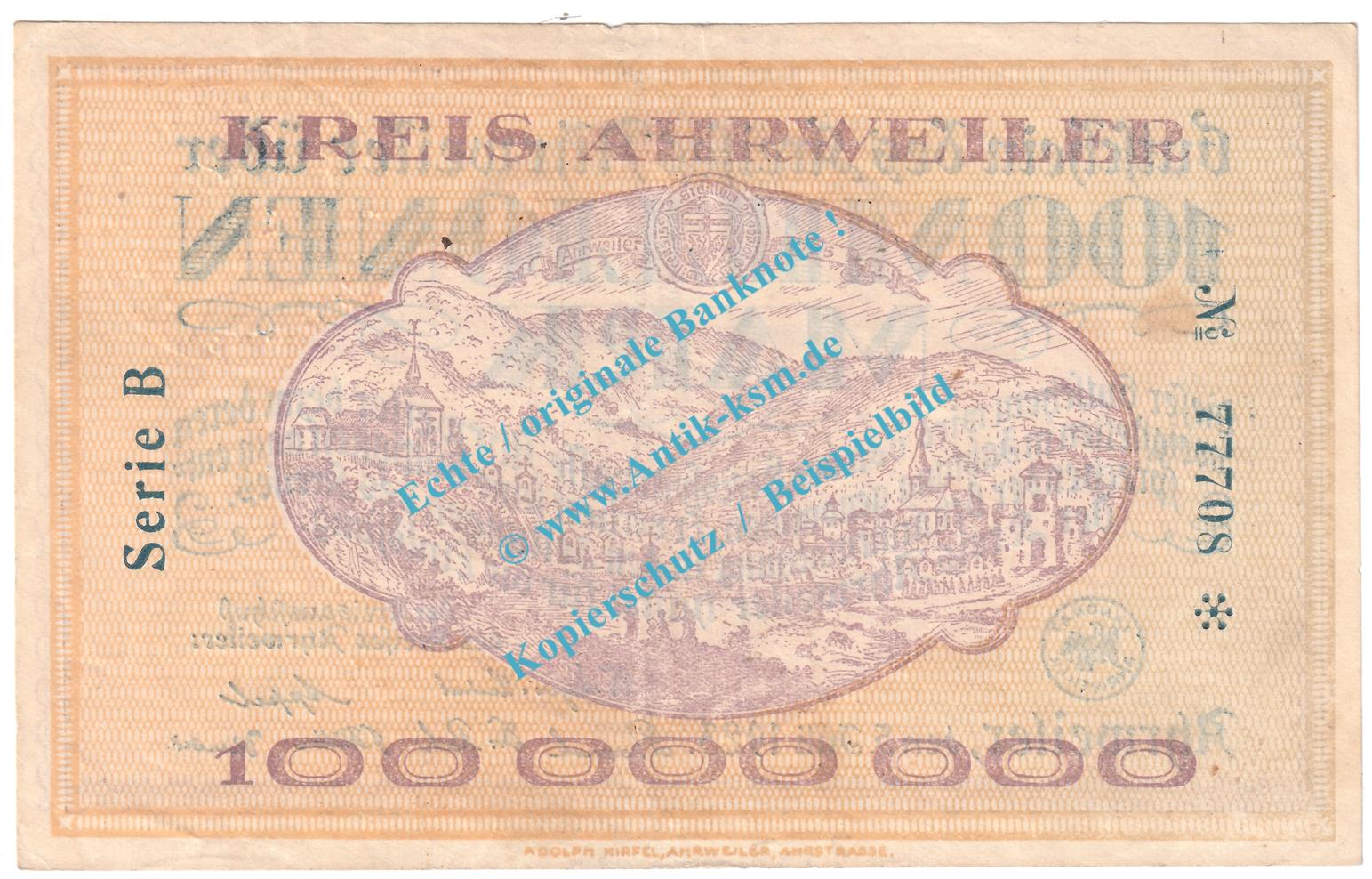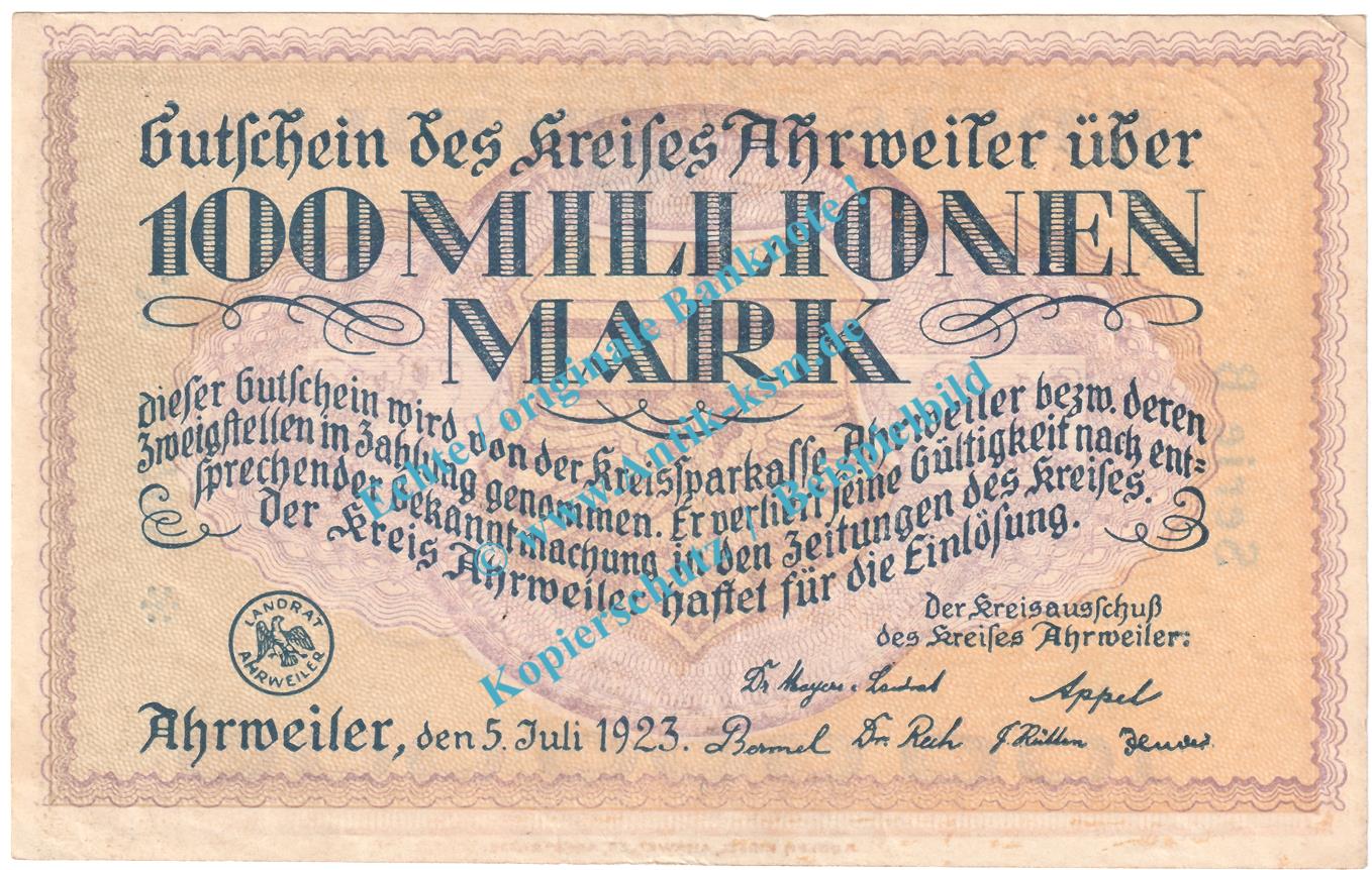 Ahrweiler , Notgeld 100 Millionen Mark -FEHLDRUCK- in kfr. Keller 28.a , Rheinland 1923 Grossnotgeld Inflation