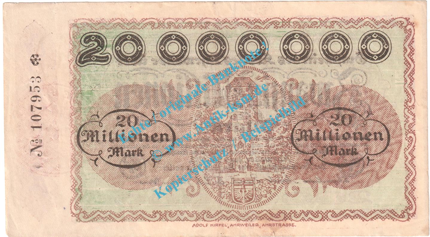 Ahrweiler , Notgeld 20 Millionen Mark -Wz- in f-kfr. Keller 28.a , Rheinland 1923 Grossnotgeld Inflation
