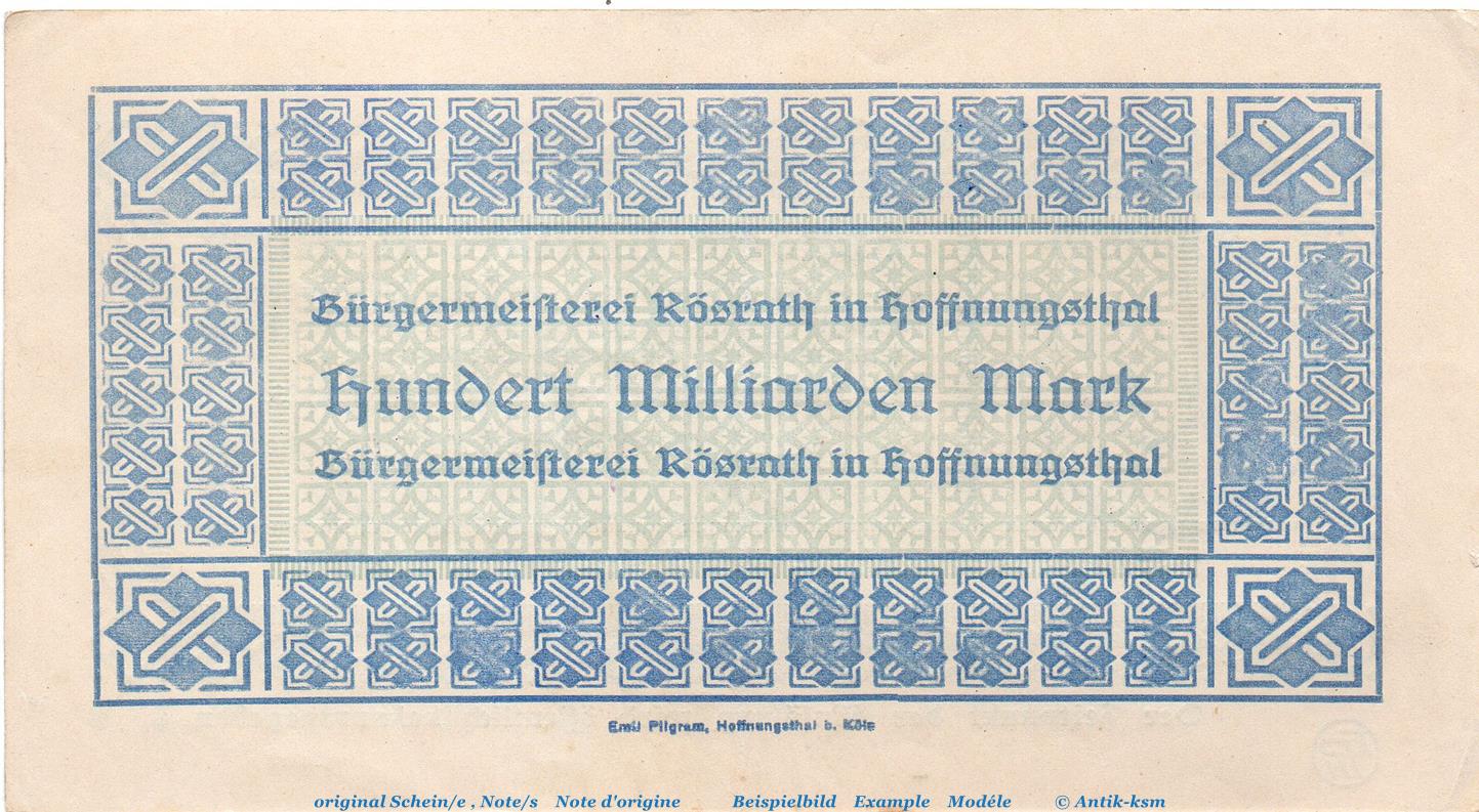 Banknote B. Amt Hoffnungsthal , 100 Milliarden Mark Schein in f-kfr. Keller 2408.c , 20.09.1923 , Rheinland Großnotgeld Inflation