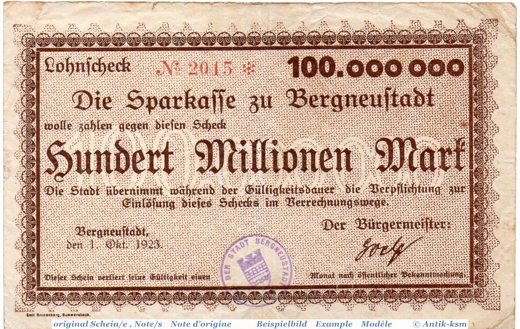 Banknote Bergneustadt , 100 Millionen Mark Schein in gbr. Keller 332.c , 01.10.1923 , Rheinland Großnotgeld Inflation
