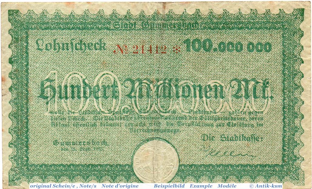 Banknote Gummersbach , 100 Millionen Mark Schein in gbr. Keller 2007.k , 15.09.1923 , Rheinland Großnotgeld Inflation