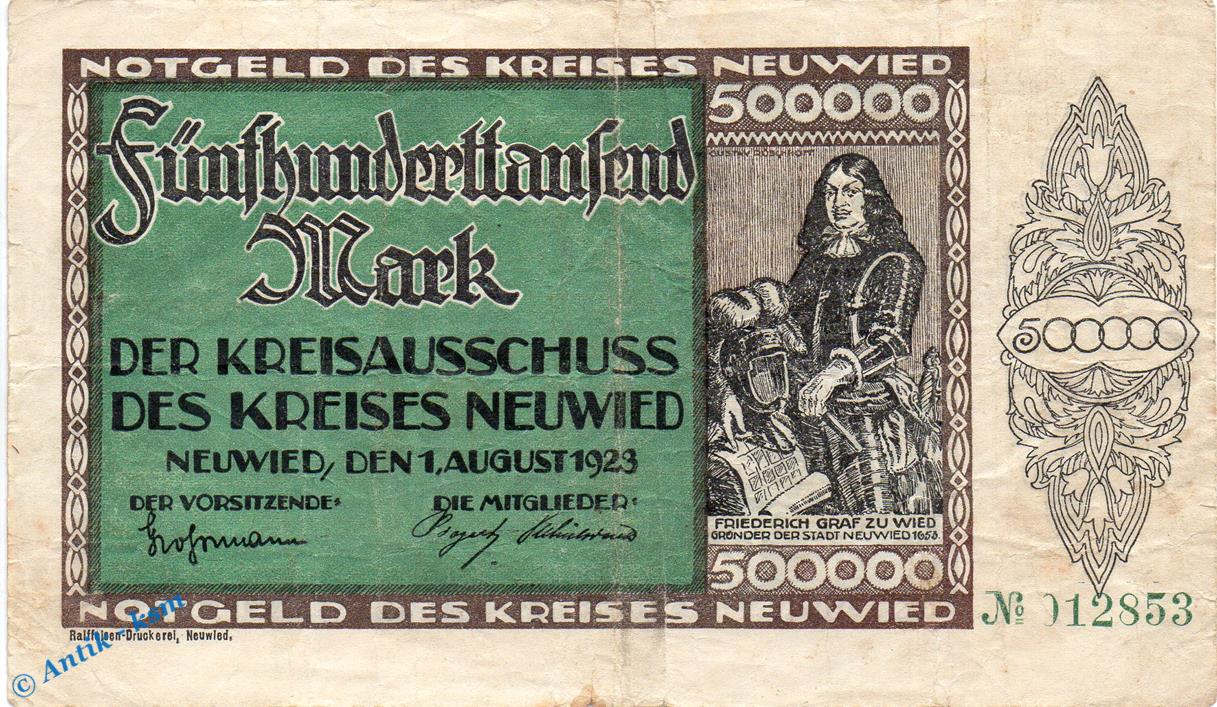 Banknote Neuwied , Kreis , 500.000 Mark Schein in gbr. Keller 3902.d , 01.08.1923 , Rheinland Großnotgeld Inflation
