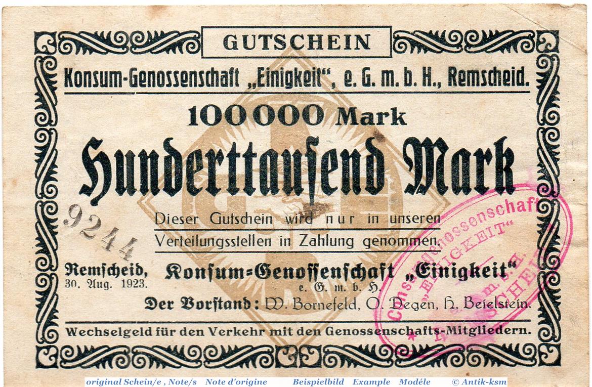 Banknote Remscheid , K. G. Einigkeit 100.000 Mark Schein in gbr. Keller 4528.d , 30.08.1923 , Rheinland Großnotgeld Inflation