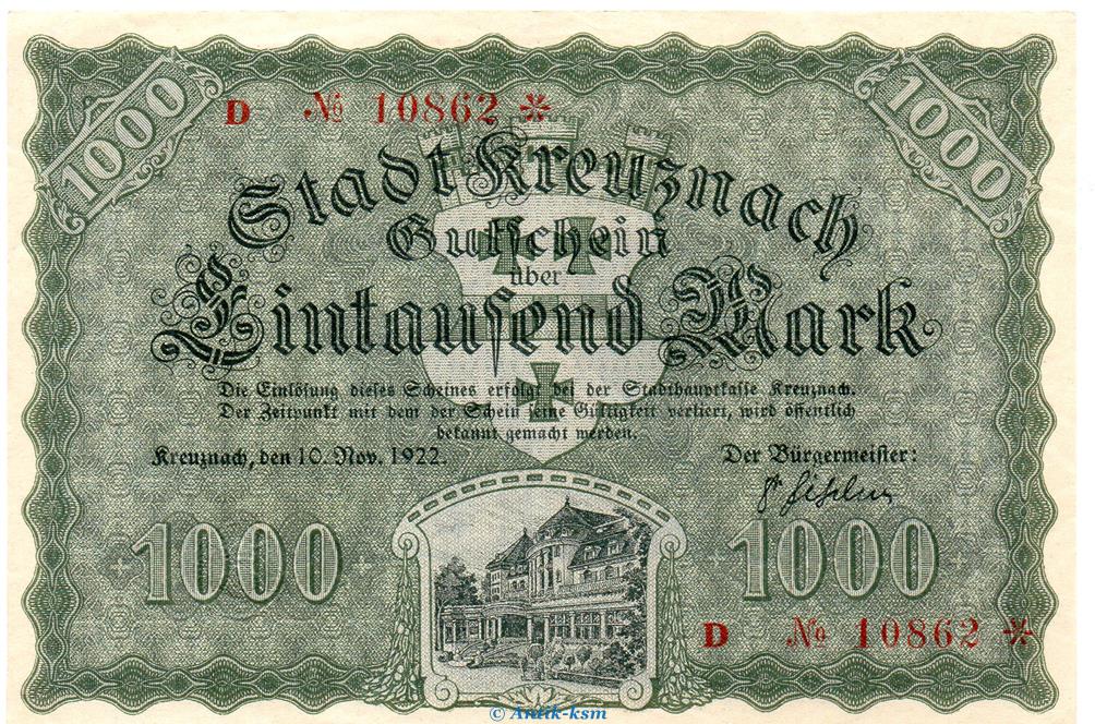 Banknote Stadt Kreuznach , 1.000 Mark Schein in kfr. Müller 2495.1.e von 1922 Rheinland Großnotgeld Inflation