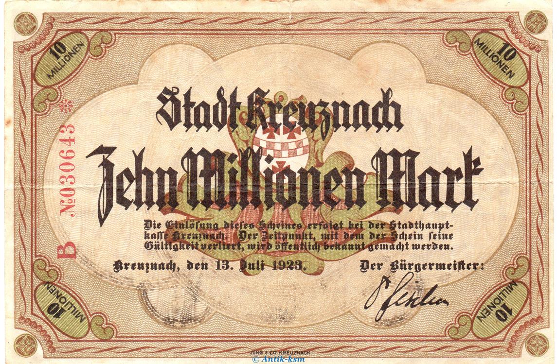 Banknote Stadt Kreuznach , 10 Millionen Mark Schein in gbr. Keller 2812.d von 1923 Rheinland Grossnotgeld Inflation