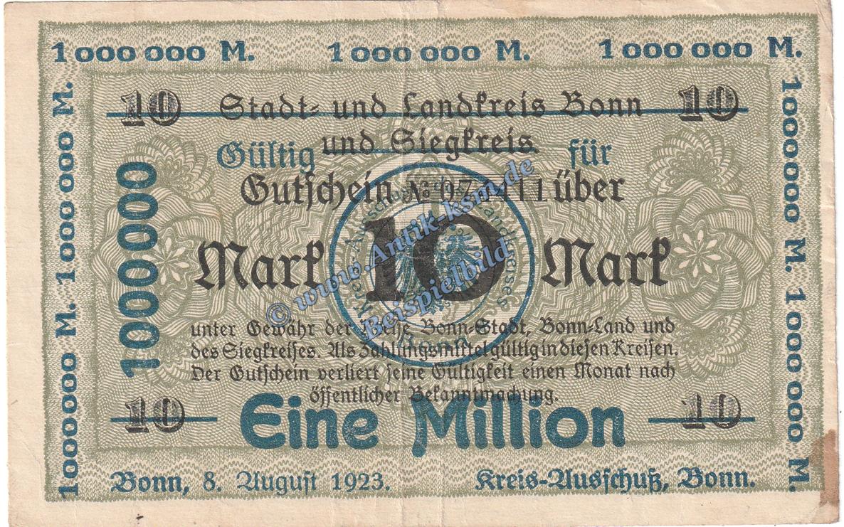 Bonn , Banknote 1 Million Mark Schein in gbr. Keller 520... Rheinland 1923 Grossnotgeld Inflation