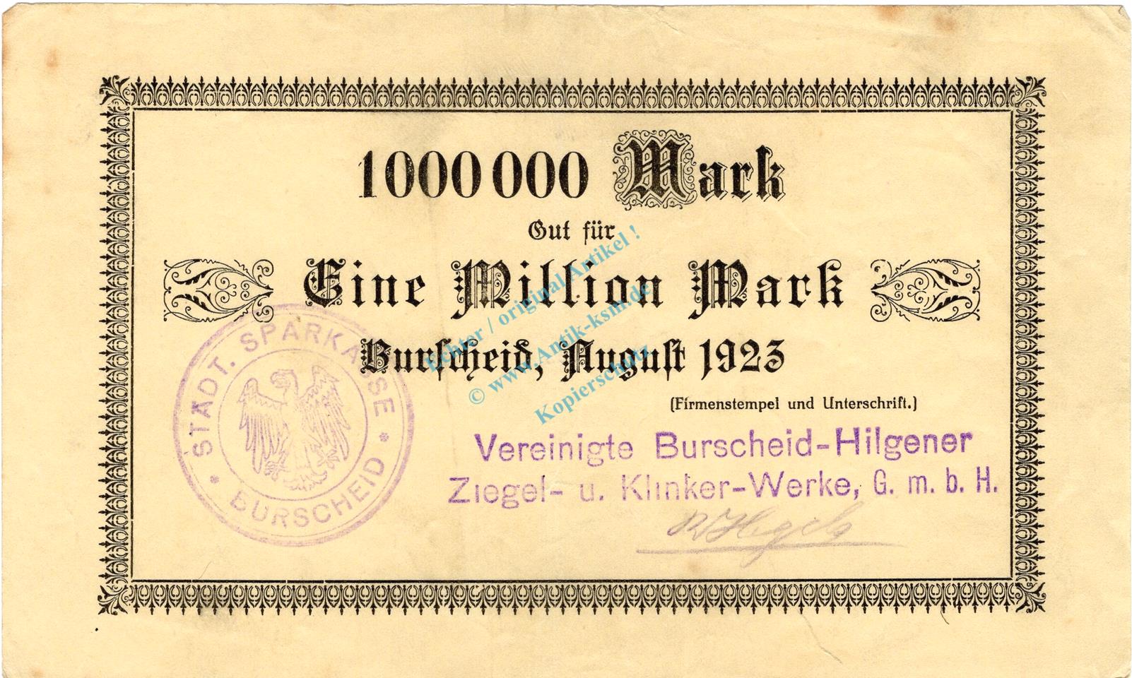 Burscheid , Banknote 1 Million Mark Schein L-gbr. Keller 696.u , Rheinland 1923 Grossnotgeld