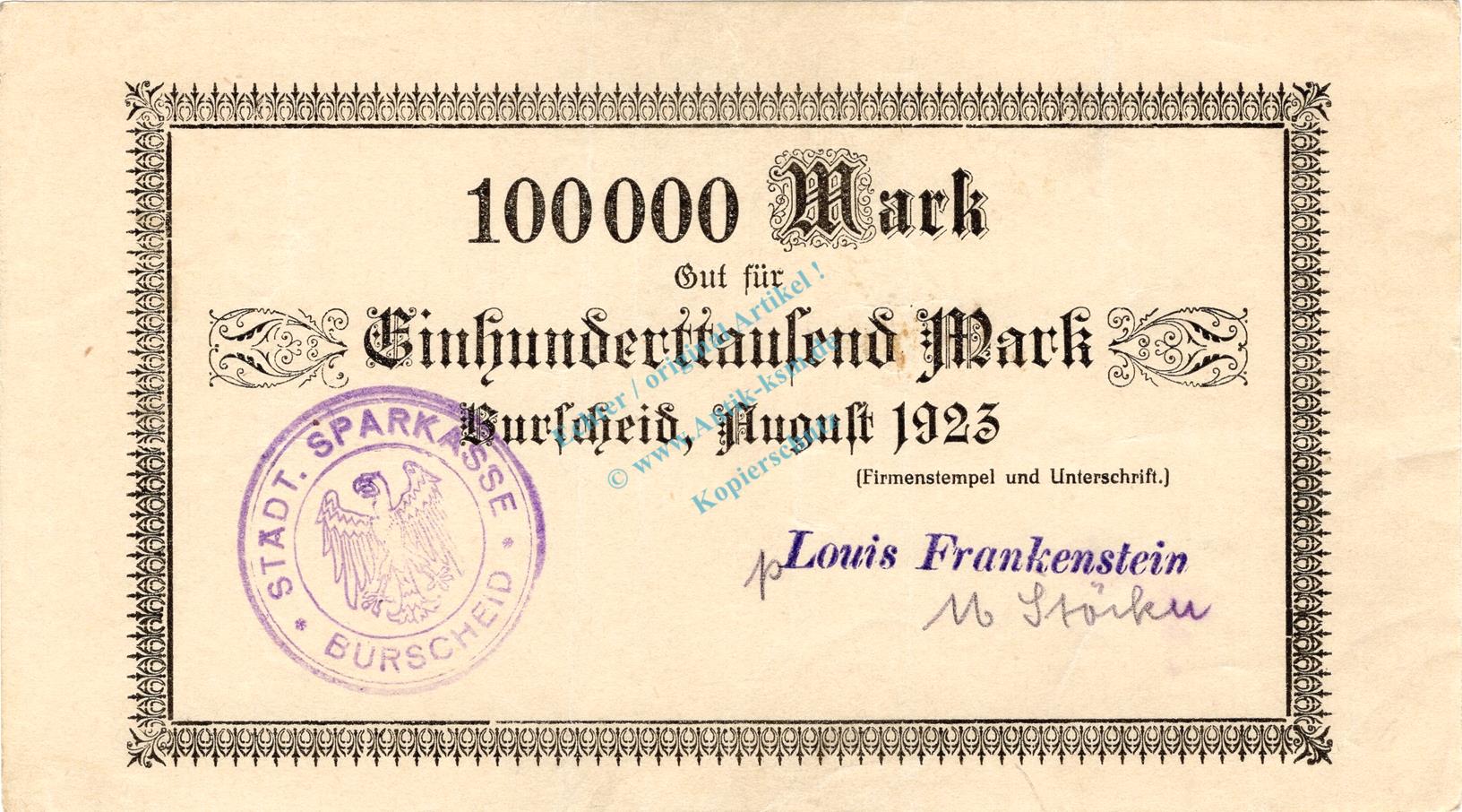 Burscheid , Banknote 100.000 Mark Schein L-gbr. Keller 696.j , Rheinland 1923 Grossnotgeld