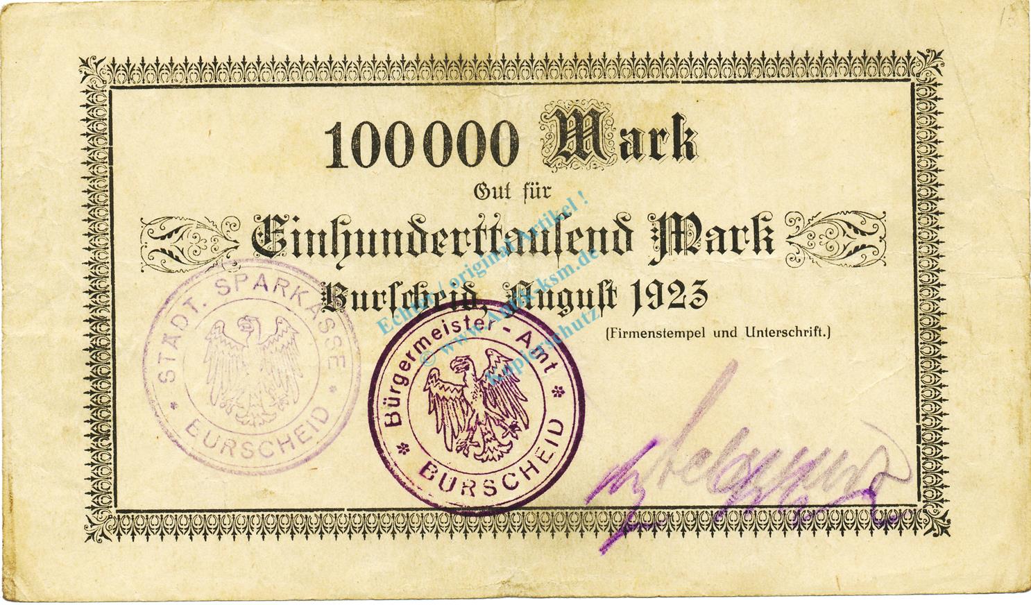 Burscheid , Banknote 100.000 Mark Schein gbrr. Keller 696 , Rheinland 1923 Inflation