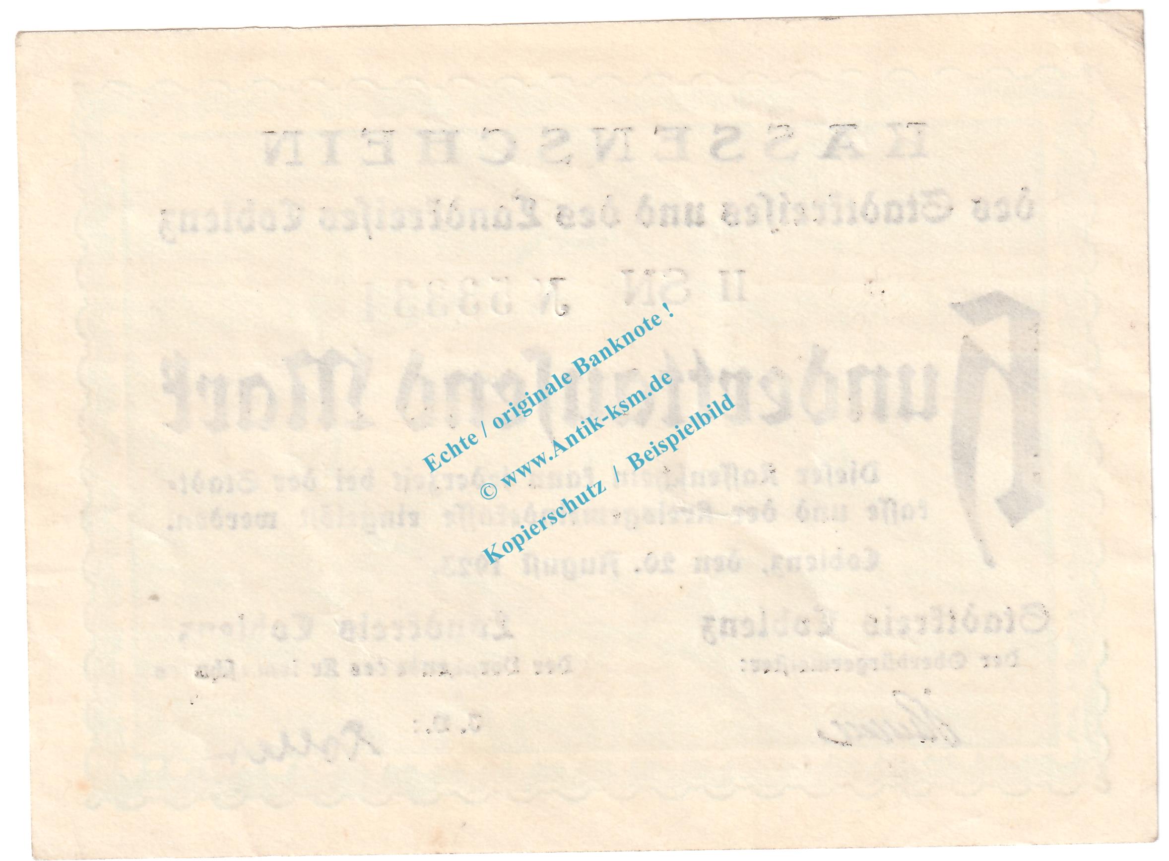 Coblenz , Notgeld 100.000 Mark Schein in kfr. Keller 866.e , Rheinland 1923 Grossnotgeld Inflation