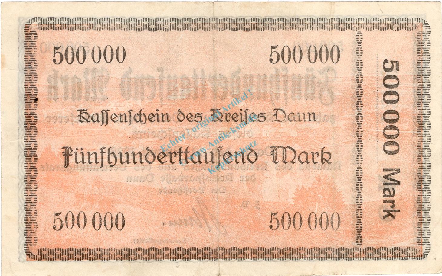 Daun , Banknote 500.000 Mark Schein in gbr. Keller 962.a , Rheinland 1923 Inflation