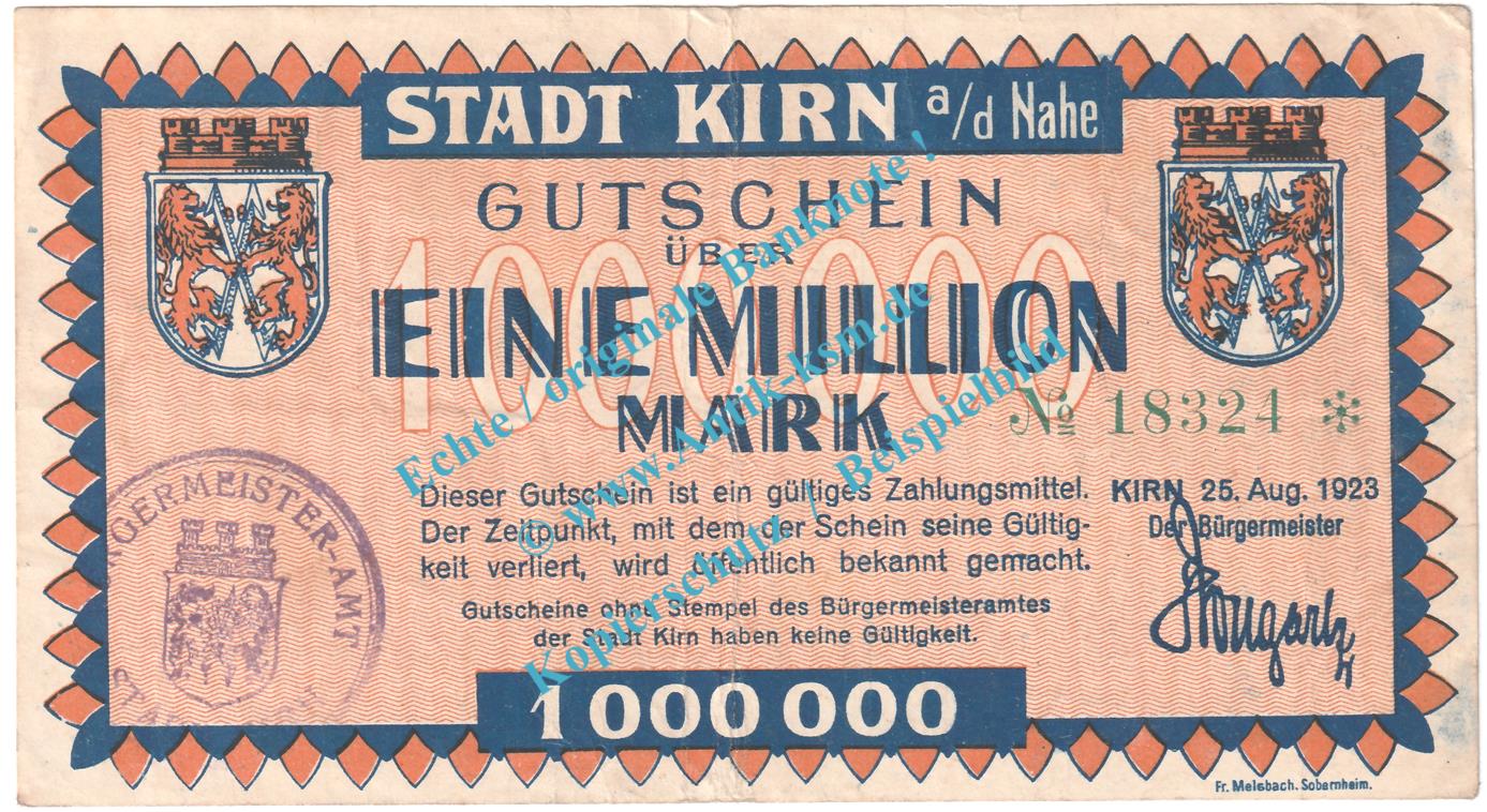 Kirn , Notgeld 1 Million Mark Schein in gbr. Keller 2658.c , Rheinland 1923 Grossnotgeld Inflation