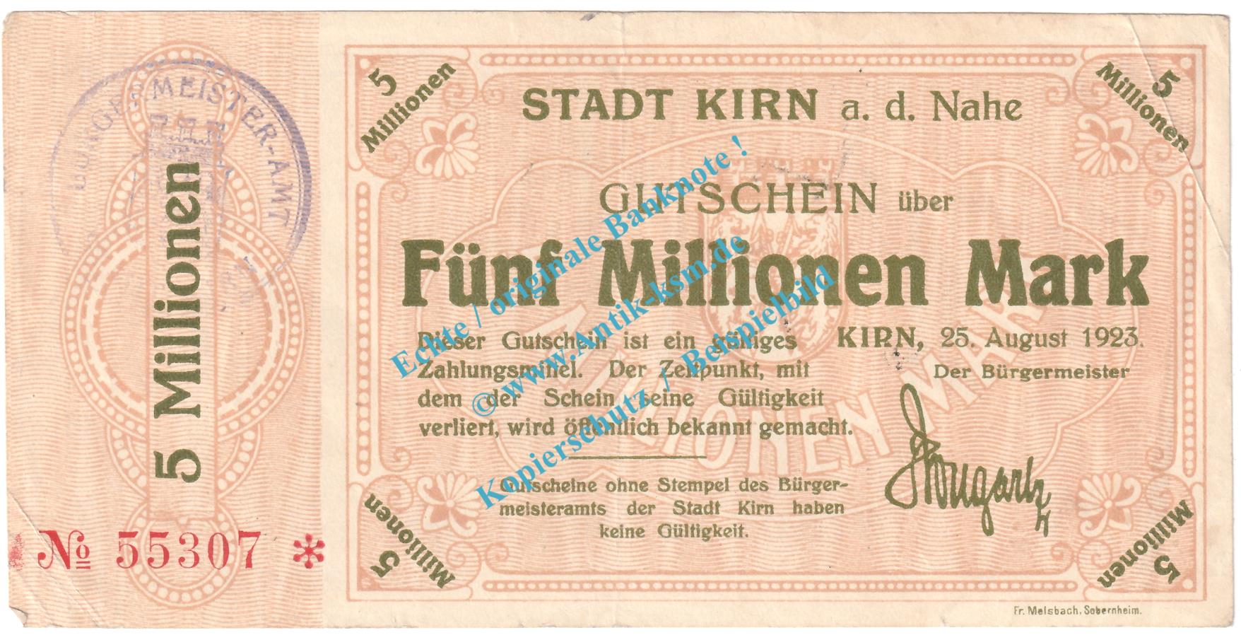 Kirn , Notgeld 5 Millionen Mark Schein in gbr. Keller 2658... Rheinland 1923 Grossnotgeld Inflation