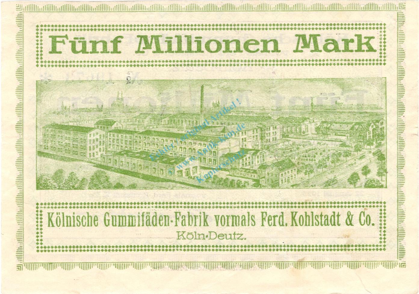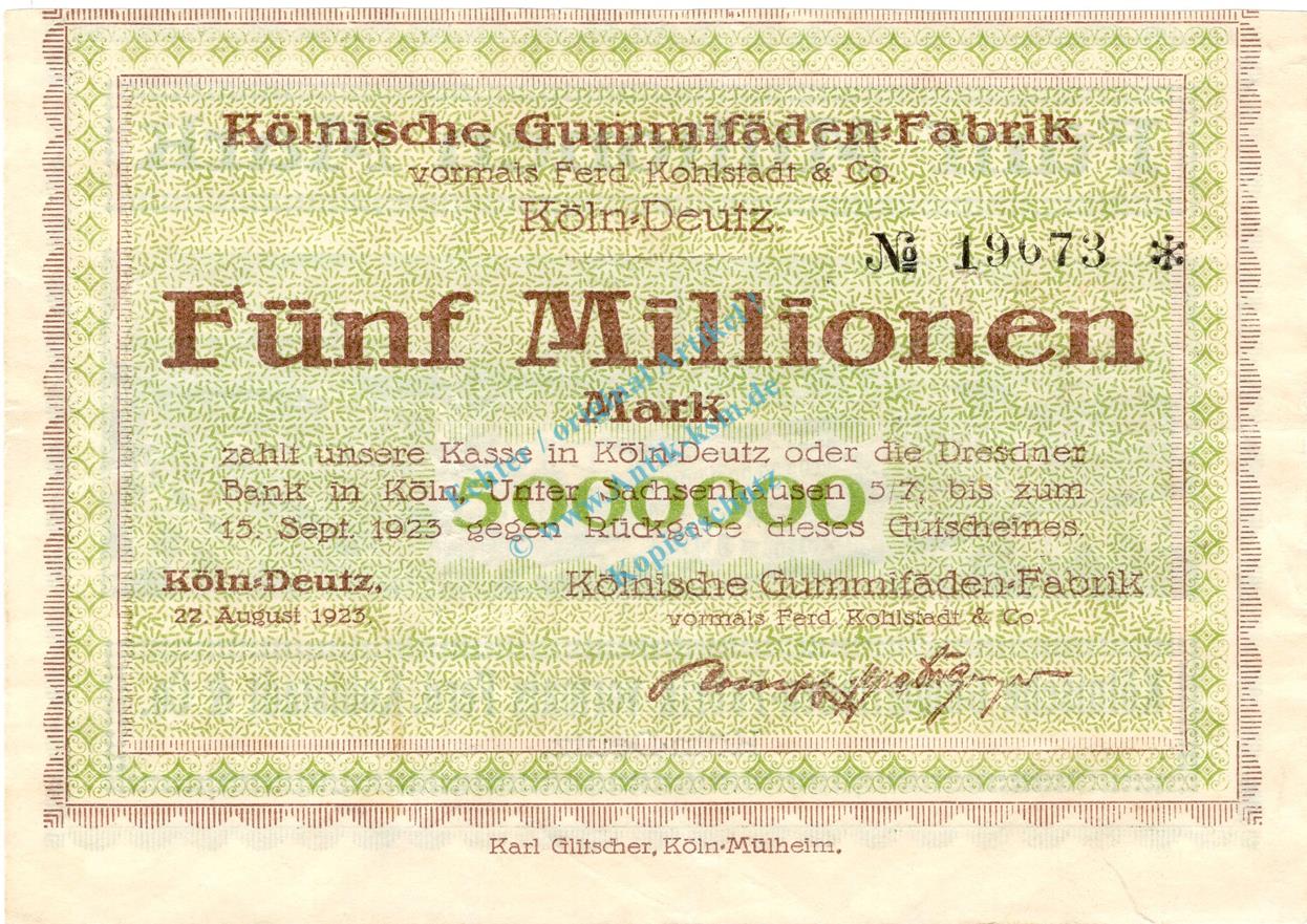 Köln-Deutz , Banknote 5 Millionen Mark Schein F-kfr. Keller 2719.c , Rheinland 1923 Inflation