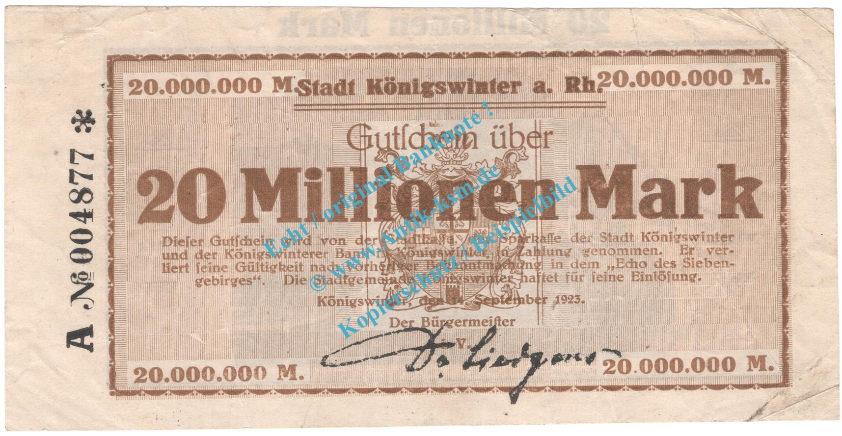 Königswinter , Notgeld 20 Millionen Mark Schein in gbr. Keller 2774.m , Rheinland 1923 Inflation