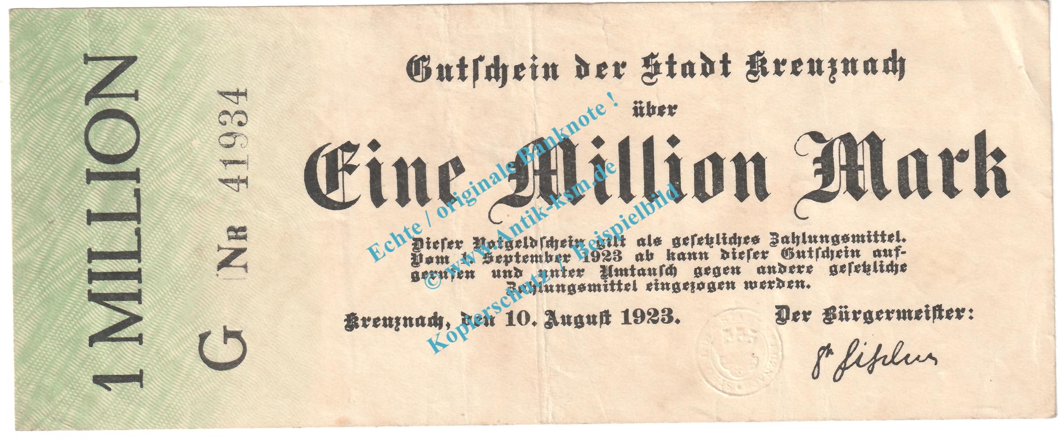 Kreuznach , Notgeld 1 Million Mark Schein in gbr. Keller 2812.f , Rheinland 1923 Grossnotgeld Inflation