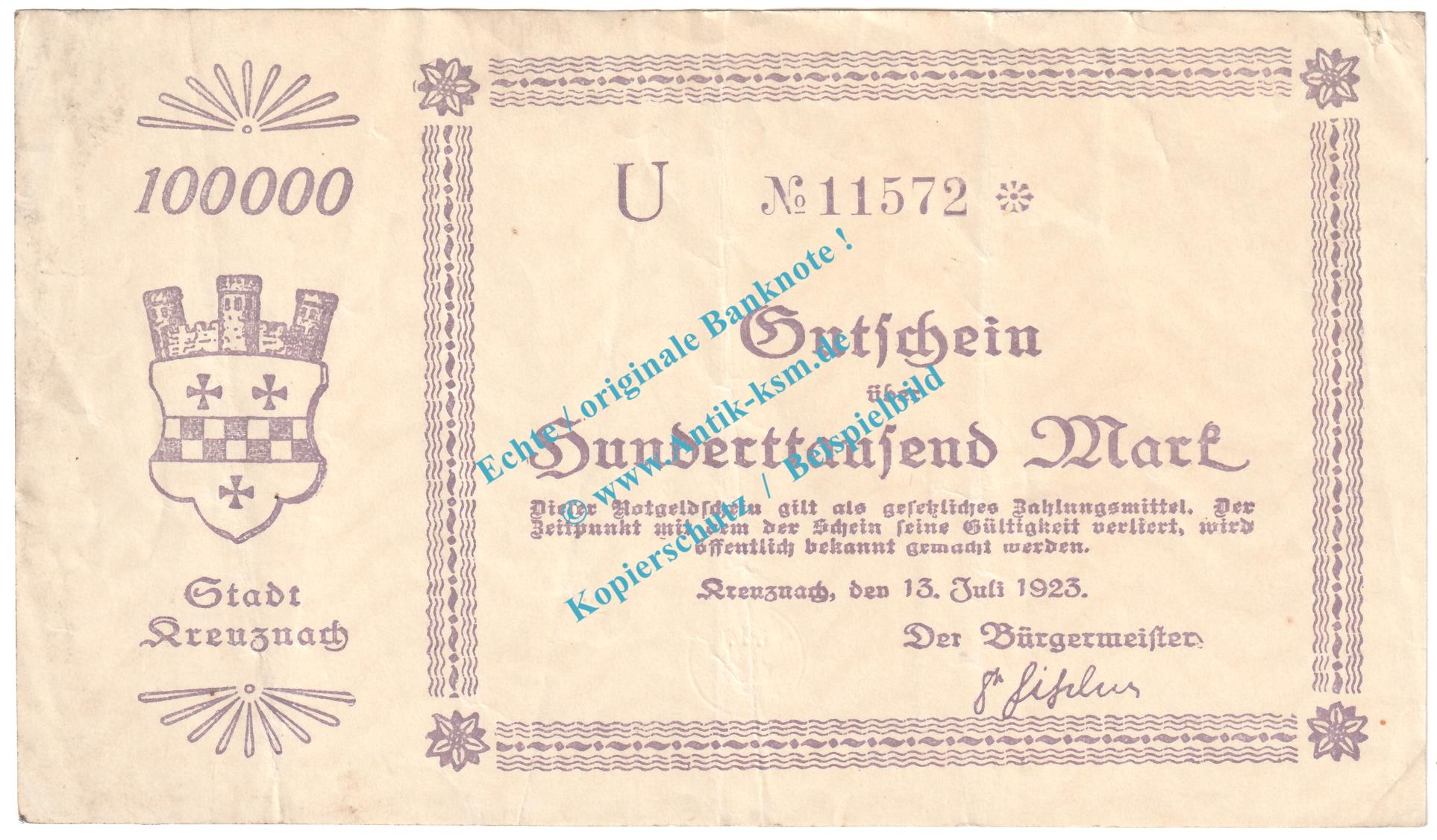 Kreuznach , Notgeld 100.000 Mark Schein in gbr. Keller 2812... Rheinland 1923 Grossnotgeld Inflation