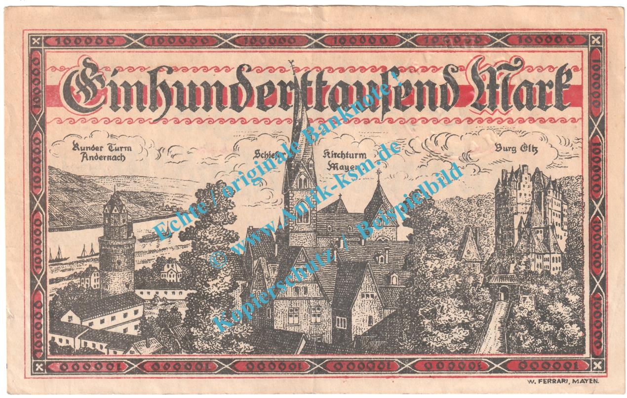 Mayen , Notgeld 100.000 Mark Schein in gbr. Keller 3487.a , Rheinland 1923 Grossnotgeld Inflation