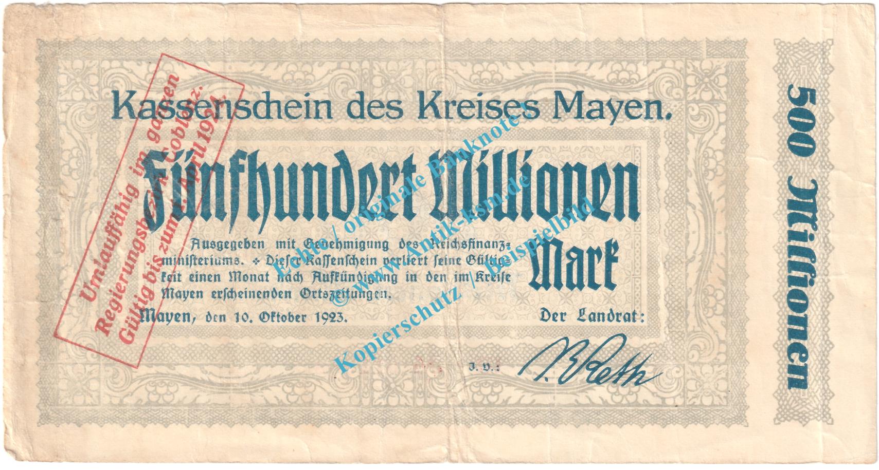 Gutschein / Banknote über Fünfhundert Millionen Mark , Kreis Mayen , Großnotgeld - Inflation