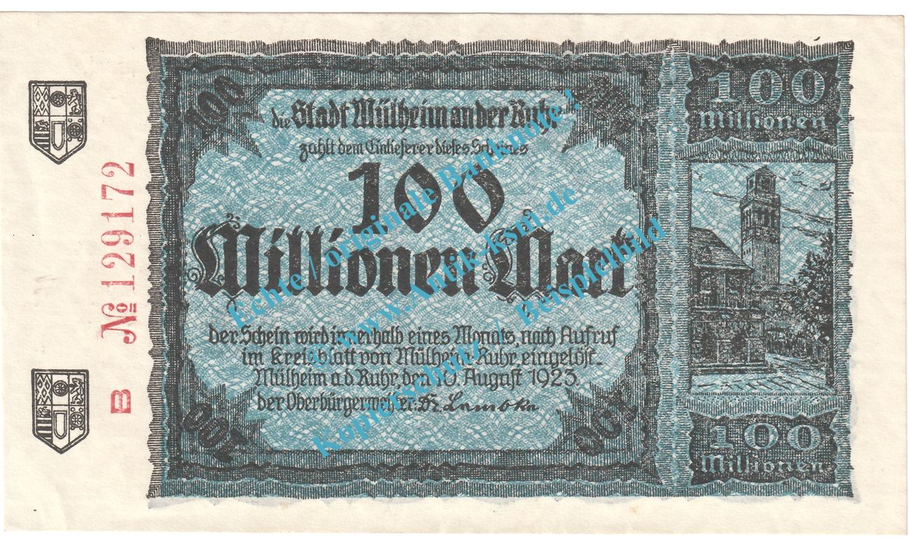 Mülheim , Notgeld 100 Millionen Mark Schein in kfr. Keller 3637.h , Rheinland 1923 Grossnotgeld Inflation