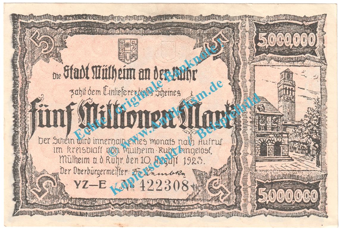 Mülheim , Notgeld 5 Millionen Mark Schein in gbr. Keller 3637.f , Rheinland 1923 Grossnotgeld Inflation
