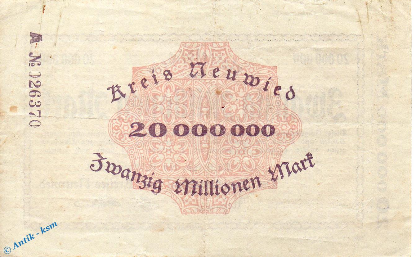 Neuwied , Notgeld 20 Millionen Mark Schein in gbr. Keller 3903.ff-hh , Rheinland 1923 Grossnotgeld Inflation