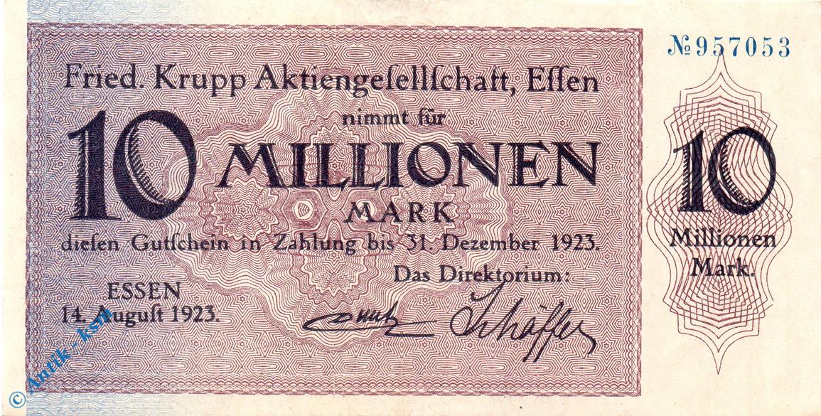 Notgeld Essen , Krupp , 10 Millionen Mark Schein , Keller 1429 m , 14.08.1923 , Rheinland Großnotgeld