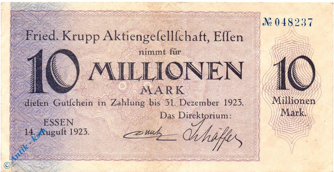 Notgeld Essen , Krupp , 10 Millionen Mark Schein gbr , Keller 1429 m , 14.08.1923 , Rheinland Großnotgeld