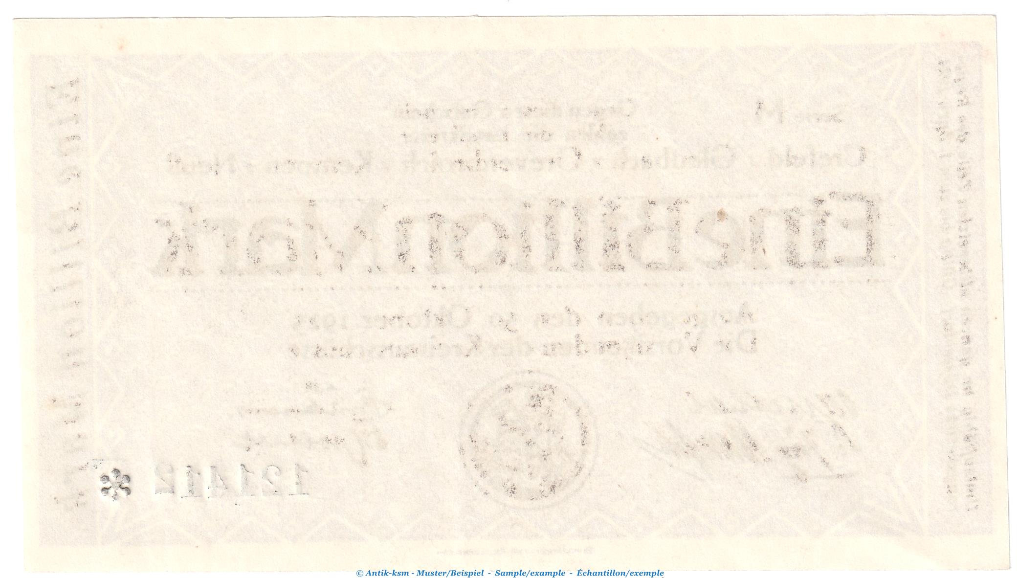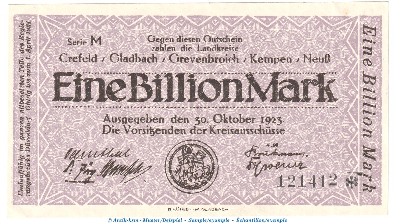 Notgeld Landkreise Crefeld u.w. 1 Billion Mark Schein in kfr. Keller 914.a von 1923 , Rheinland Inflation
