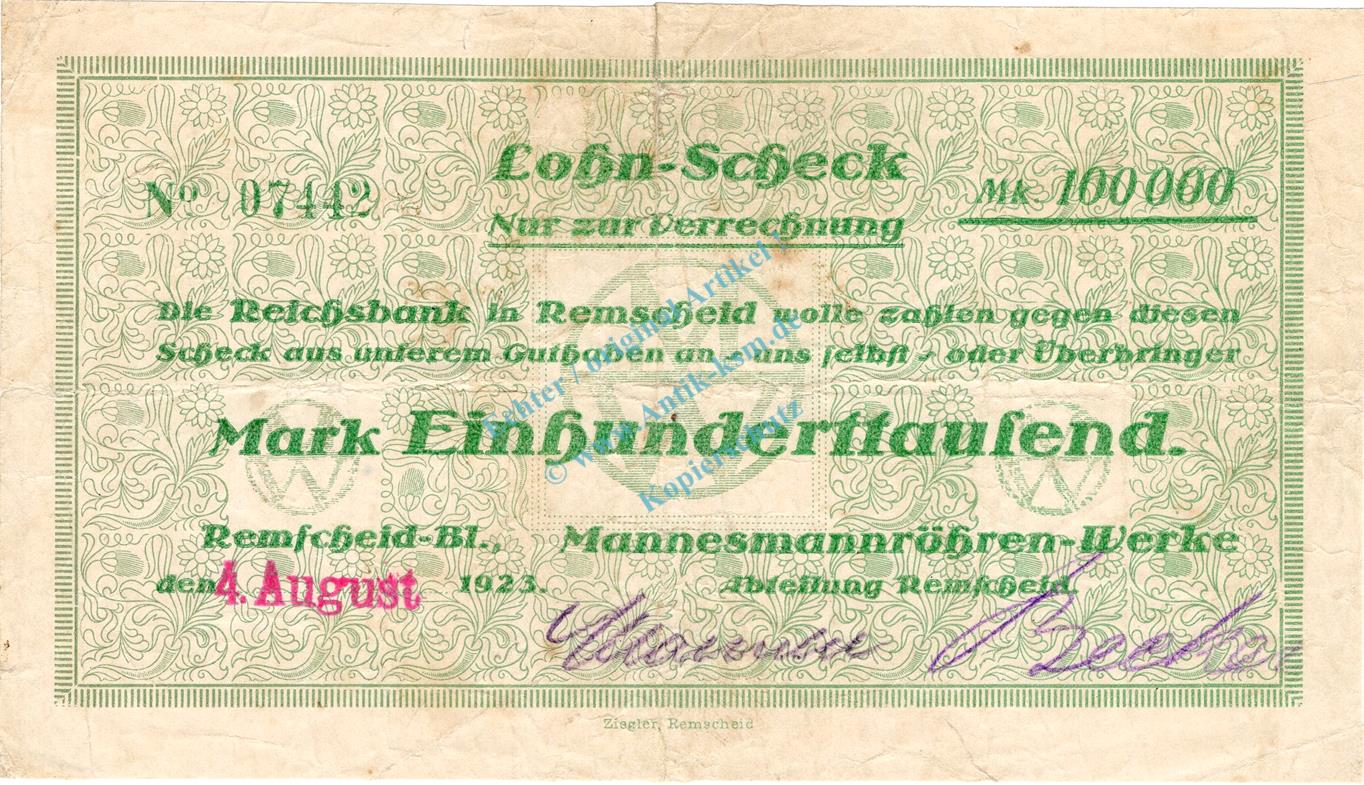 Scheck auf Reichsbank in Remscheid , -4 Aug- gest.