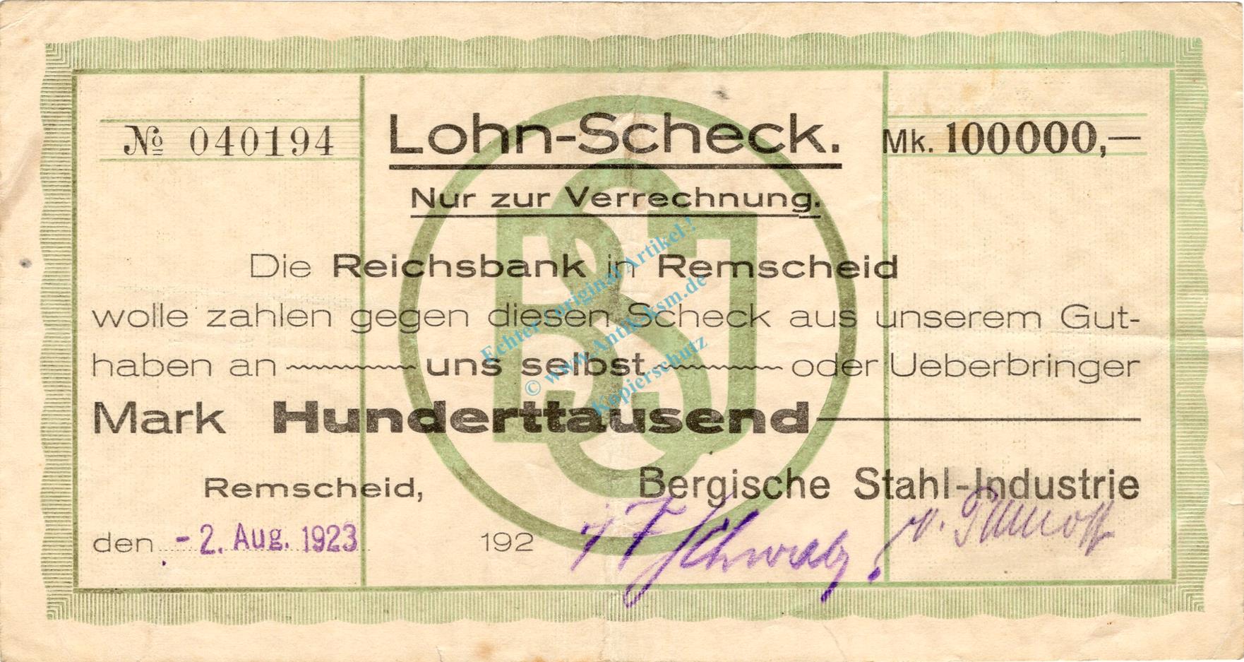 Lohn - Scheck : Bergische Stahl-Industrie , Remscheid