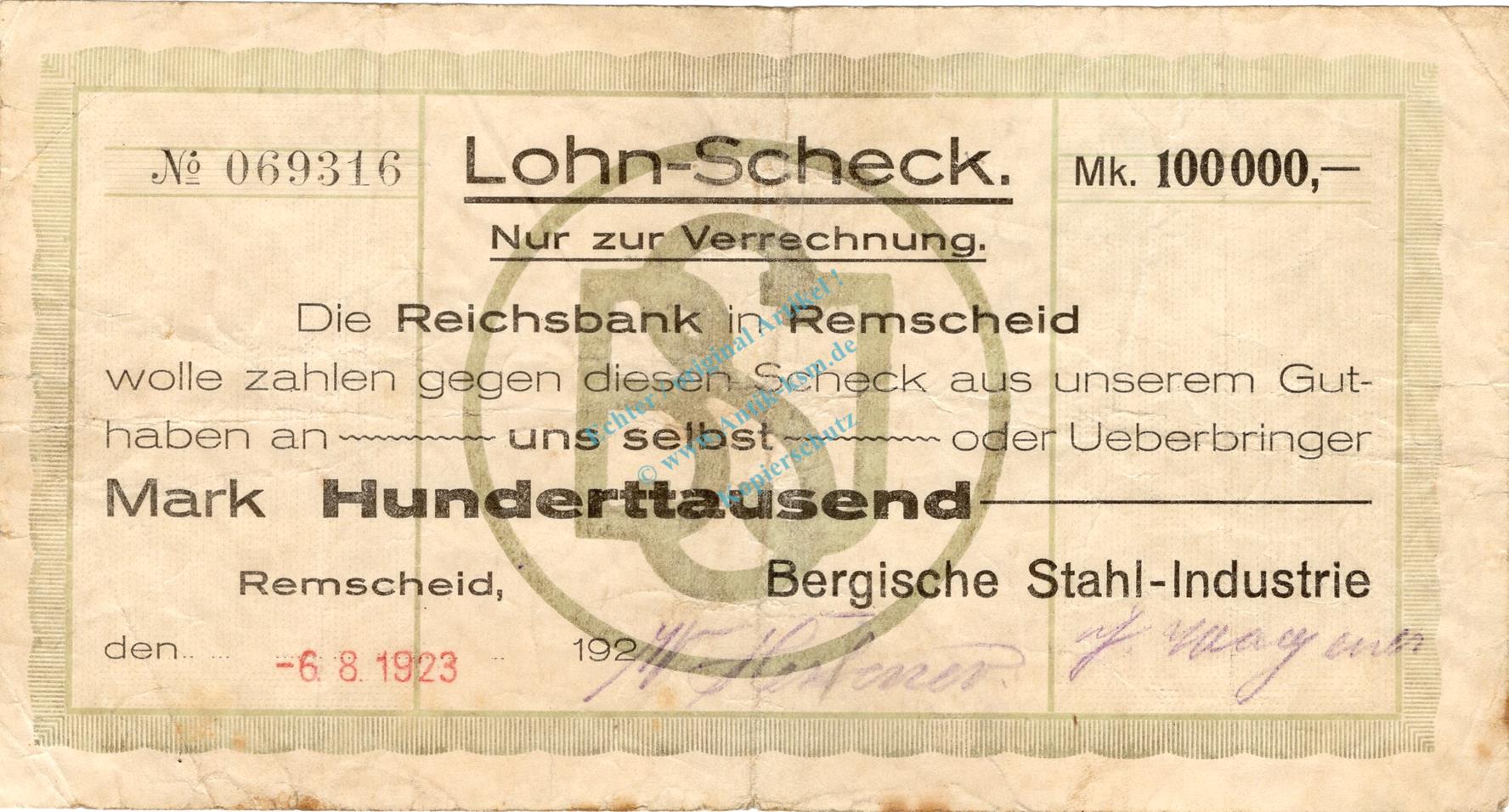 Lohn - Scheck : Bergische Stahl-Industrie , Remscheid