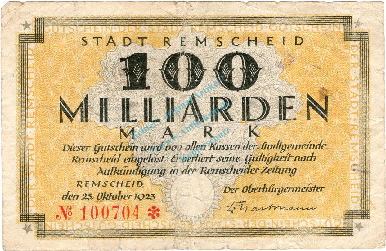 Remscheid , Banknote 100 Milliarden Mark Schein gbr-. Keller 4515.h , Rheinland 1923 Inflation