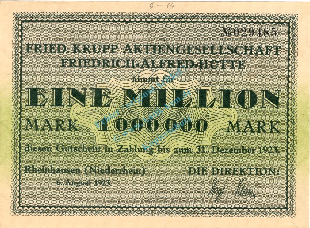 Rheinhausen , Banknote 1 Million Mark unc-kfr. Keller 4558.b , Rheinland 1923 Inflation