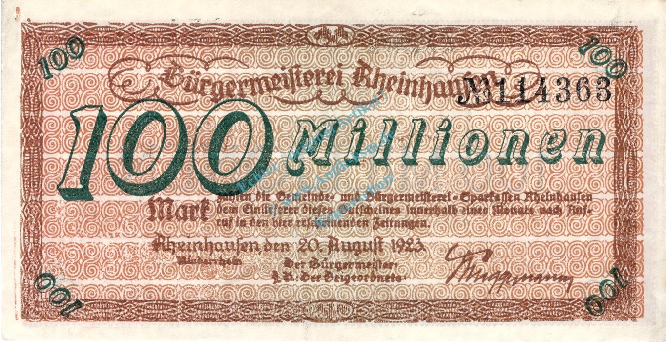 Rheinhausen , Banknote 100 Million Mark unc-kfr. Keller 4557.d , Rheinland 1923 Inflation