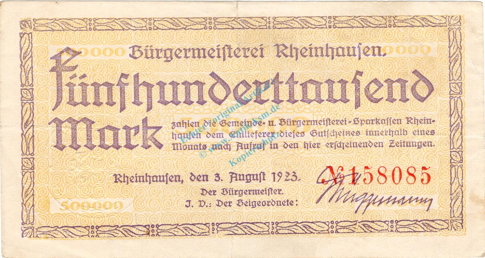 Rheinhausen , Banknote 500.000 Mark Schein gbr. Keller 4557.a , Rheinland 1923 Inflation